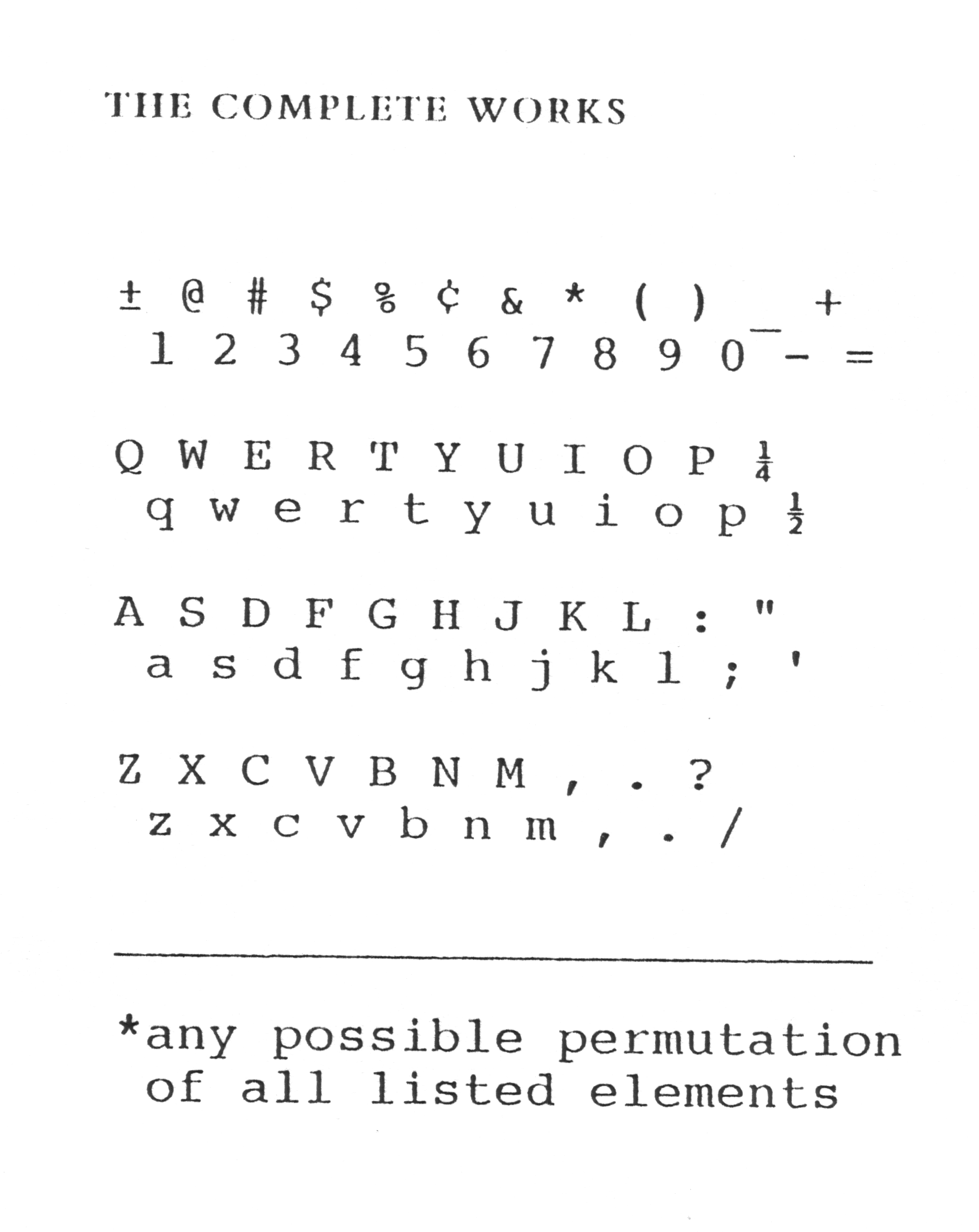 The Complete Works, as the title of this film, alludes to a work in which Nichol typed out on a page all the letters and signs as they appear on the keys of the typewriter with the footnote “any and all permutations of the above listed elements.” Complete works anthologies presume to collect the life’s work of an author. .